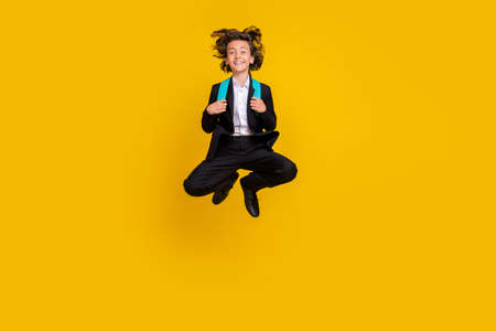 Photo of funny carefree little boy jump enjoy break wear bag black uniform isolated yellow color background