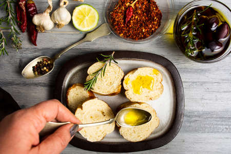 Woman making bruschetta snacks first person view