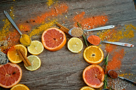 the fragrance of spices, red pepper, black pepper, mustard,sunflower seeds ,and orange slices of citrus fruits on dark wooden background of the table. Closeup top view