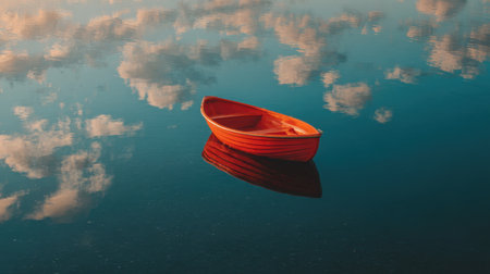 Vibrant red boat floats serenely on calm water, reflecting fluffy clouds in clear blue sky. tranquil scene evokes sense of peace and solitude, perfect for relaxation