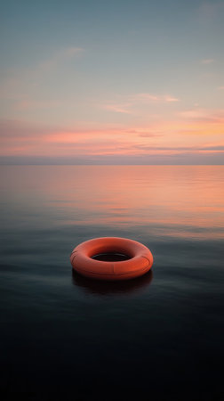 Serene sunset over calm ocean with solitary orange lifebuoy floating peacefully. Tranquility and solitude concept