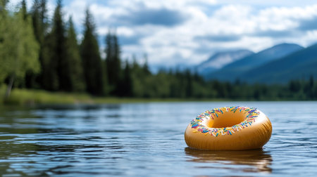 A vibrant yellow inflatable ring floats peacefully on a calm lake, with a backdrop of lush green trees and majestic mountains under a cloudy sky.