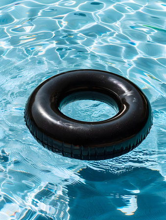 Close up of an anthracite inflatable ring floating on pool water. Colorful Summer Wallpapers