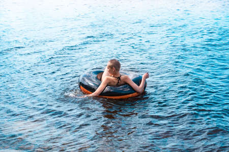 Joyful child on inflatable ring ride on breaking wave. Travel lifestyle, swimming activities. Selective focus
