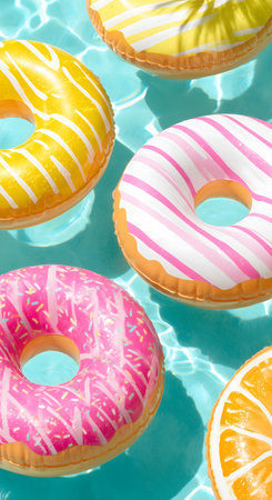 Bright colorful donut and fruit slice shaped inflatable swim rings floating on blue water, symbolizing summer vacation fun