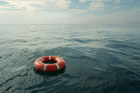 A bright orange lifebuoy rests on the smooth surface of the water, surrounded by an expansive clear sky. The scene conveys a sense of tranquility and safety.