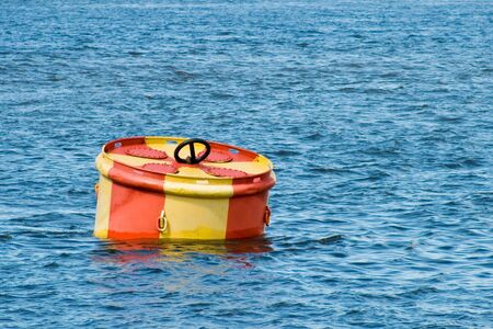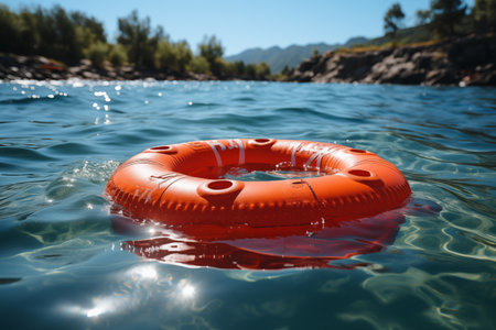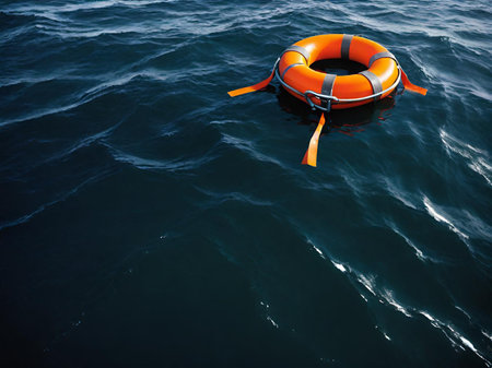 Lifebuoy floats in rough sea waters. Safety and rescue concept. Generative AI