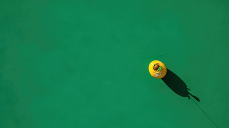A vibrant yellow float rests on a calm green water surface, capturing the essence of summer relaxation and leisure under the warm sunshine, evoking feelings of tranquility.