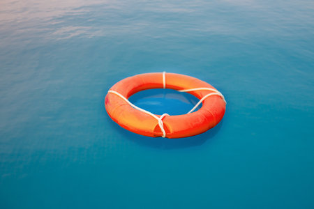 A lifebuoy with orange and white stripes gently floats on the surface of calm water. Sunlight sparkles on the ripping water, creating a serene scene.