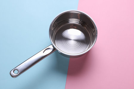 A sleek stainless steel saucepan positioned on a clean white background, ideal for showcasing culinary excellence, cooking techniques, and kitchen aesthetics.