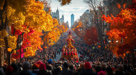 An aerial view of a vibrant parade featuring beautifully decorated floats and excited crowds. The urban backdrop showcases modern buildings under a sunny sky, embodying a festive atmosphere.