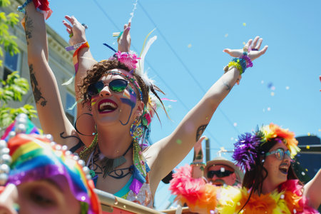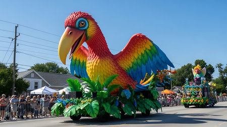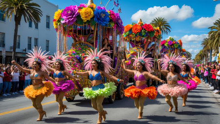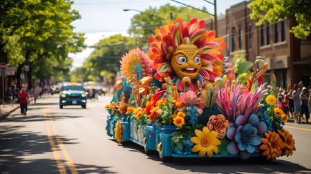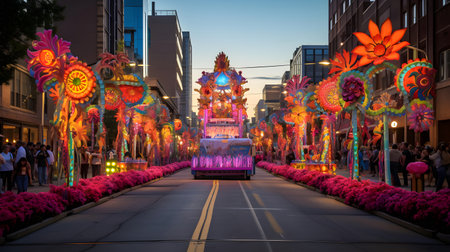 Vibrant summer parade with colorful floats and festive crowd in urban setting.