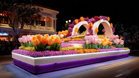 A stunning floral parade float featuring vibrant tulips and a variety of flowers, illuminated under the night sky, celebrating spring and joy.