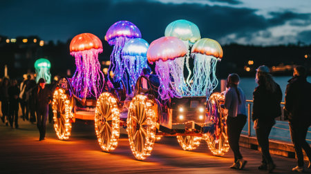 nighttime parade with bioluminescent jellyfish floats on a beachside boardwalk --chaos 30 --ar 16:9 --v 6.1 Job ID: a680fd94-0fd5-4564-97f8-98add73ea013