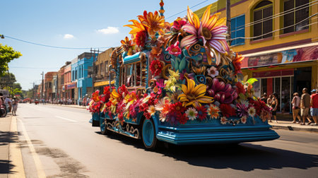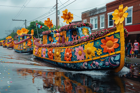 Colorful Flower-Adorned Boats Parading Down the Street During Vibrant Festival Celebration