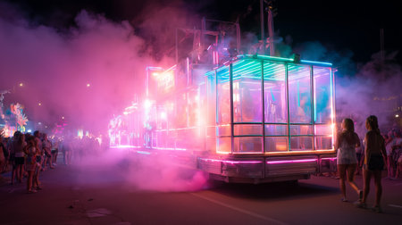 A float decorated with vibrant lights shining brightly at night during a festive event, Flamboyant floats adorned with glitter and lights