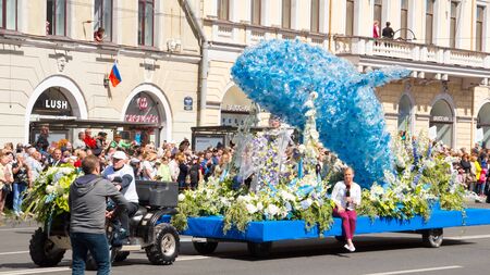 St. Petersburg, Russia-June 12, 2019. Flower festival . Nevsky prospect. Many people came to the festival. Platform, decorations, flowers.