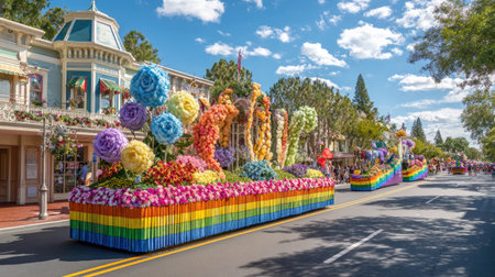 A stunning display of vibrant floral parade floats adorned with rainbow accents, set against a bright blue sky, creating a festive atmosphere.