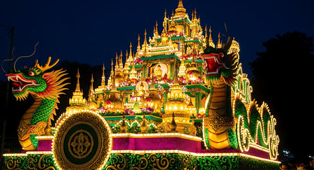 Elaborate illuminated float with dragon sculptures at night during a festival