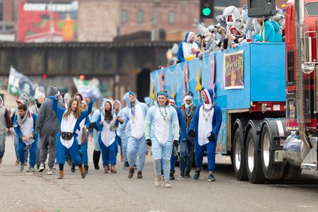 St. Louis, Missouri, USA - March 2, 2019: Bud Light Grand Parade, Members of Krewe of Re, dress up as sharks, going down 7th street during the parade
