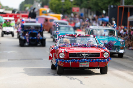 Arlington, Texas, USA - July 4, 2019: Arlington 4th of July Parade, a Ford, Mustang, leading a group of classic cars, during the parade