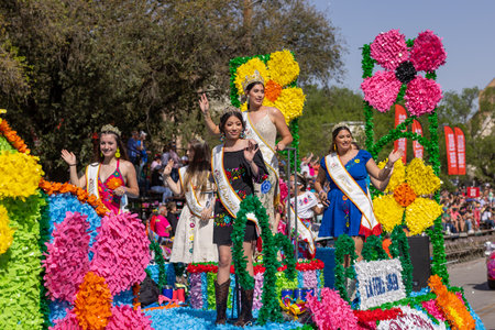 San Antonio, Texas, USA - April 8, 2022: The Battle of the Flowers Parade, Float carrying the Reina Feria de las Flores and her court