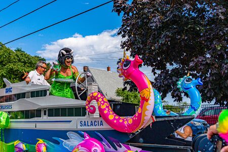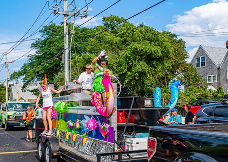 Provincetown, Massachusetts US - August 22, 2019 People walking in the Annual Provincetown Carnival Parade on Commercial Street.