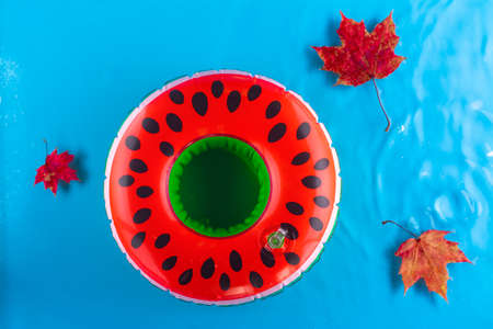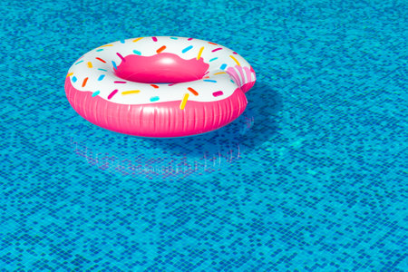 Inflatable ring in donut shape in a clear water of swimming pool. Beach vacation, relax and leisure concept
