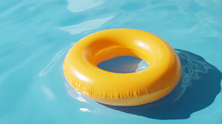 A bright yellow float ring floats serenely on a tranquil turquoise water surface. Perfect for summer days, this image evokes feelings of relaxation, adventure, and fun.