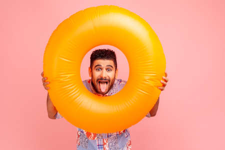 Portrait of brunette bearded crazy excited man holding orange rubber ring in hands, looking at camera with funny expression, showing tongue out. Indoor studio shot isolated on pink background.