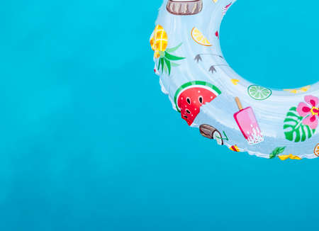 Close up of a turquoise inflatable ring floating on pool water. Colorful Summer Background