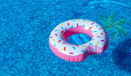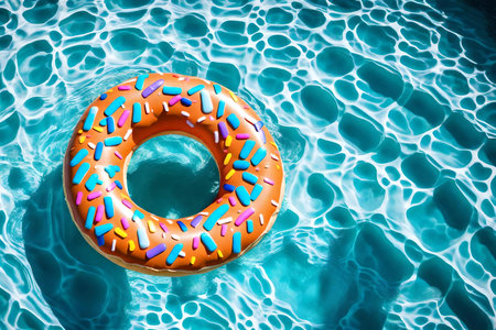 Hipster sprinkled donut float in sunny pool background straight down on bright clear pool water