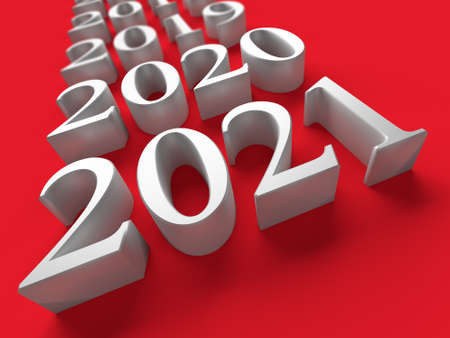 White number of new 2021 year near old years on red background. 3d rendering