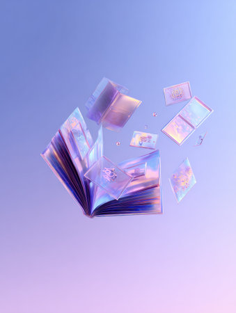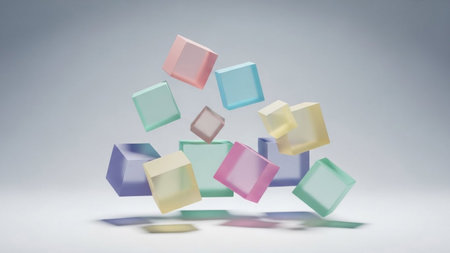 A collection of translucent, pastel-colored geometric shapes, like diamonds and cubes, are suspended and falling in a soft, ethereal light.