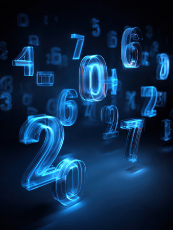 Numbers in various sizes illuminate a dark backdrop, creating a futuristic atmosphere reflecting themes of technology and digital information.