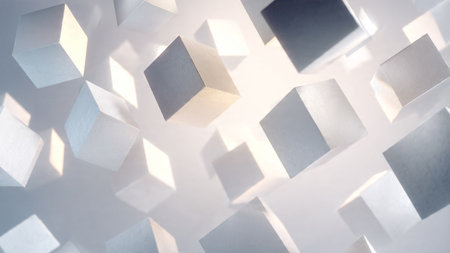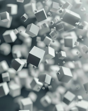 A visually striking arrangement of cubes in various shades of gray and white, with light reflections adding depth and dimension to the geometric pattern.