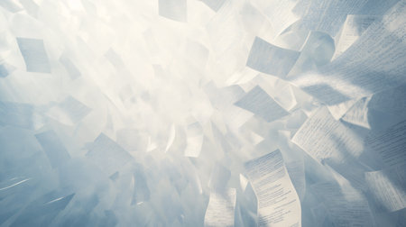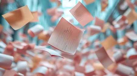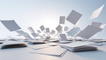 A dynamic image of papers and documents flying in the air, symbolizing information overload or a creative burst.