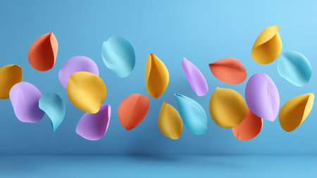 A visually captivating arrangement of colorful paper petals floating in the air against a light blue background, perfect for spring-inspired designs and artistic projects.