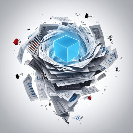 In the heart of a chaotic storm of paperwork and bureaucracy, a glowing blue cube emerges.
