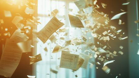 Documents and papers are scattered mid-air in a bright, sunlit office, creating a sense of chaos and disarray. The warm light adds a surreal, dreamlike quality to the scene.