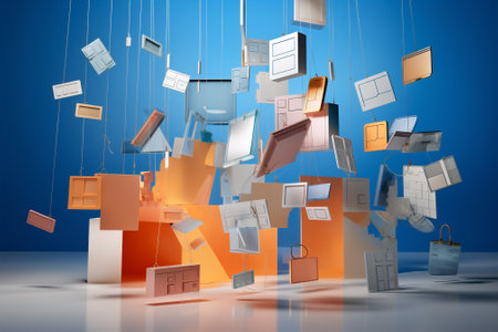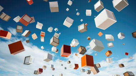 An artistic image featuring numerous floating cubes against a vibrant blue and pink backdrop, creating a sense of depth and visual interest.