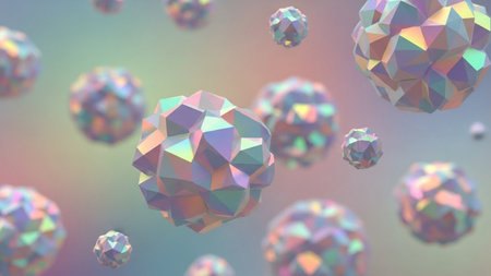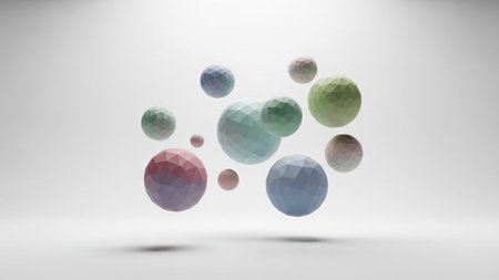 Abstract 3d rendering of multicolored low poly spheres. Bokeh background with polygonal spheres.