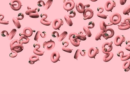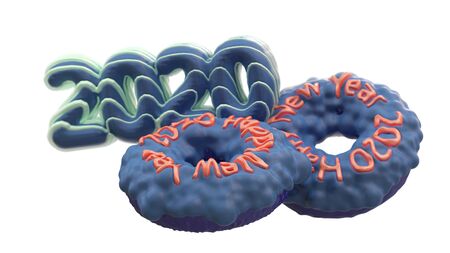 Happy New Year 2020 in the form of blue donuts poured on top of a pink caramel. New Year sign. 3d rendering isolated on white background Selective focus macro shot with shallow DOF