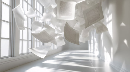 Sheets of paper swirl and flutter in the air, creating a whimsical scene of movement.