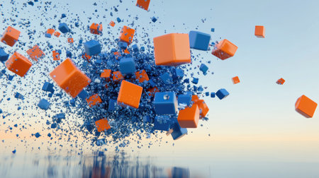 This image showcases a vibrant explosion of colorful cubes in shades of blue and orange, creating a sense of dynamic movement and energy. The soft gradient background enhances the visual impact, making it ideal for abstract design projects and modern art explorations.