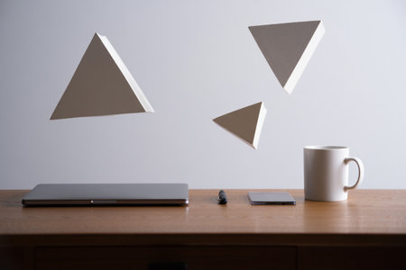 Office desk with laptop, coffee cup and geometric shapes on white wall