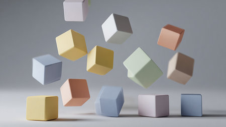 3d rendering of colorful cubes flying in the air on grey background