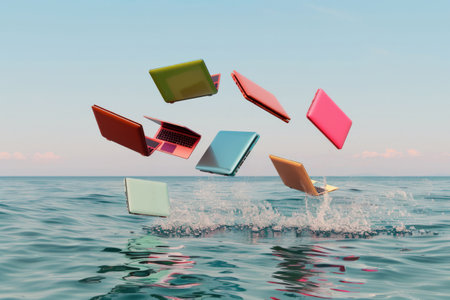 Falling laptops against the sea and sky. Concept of summer vacations and vacations.