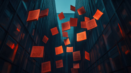 An artistic view of floating red pages between modern buildings, creating a striking contrast against the urban skyline.
