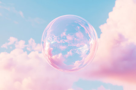 A cute, transparent pink bubble floats against a whimsical sky, surrounded by soft clouds and sunlight, evoking feelings of wonder and lightness